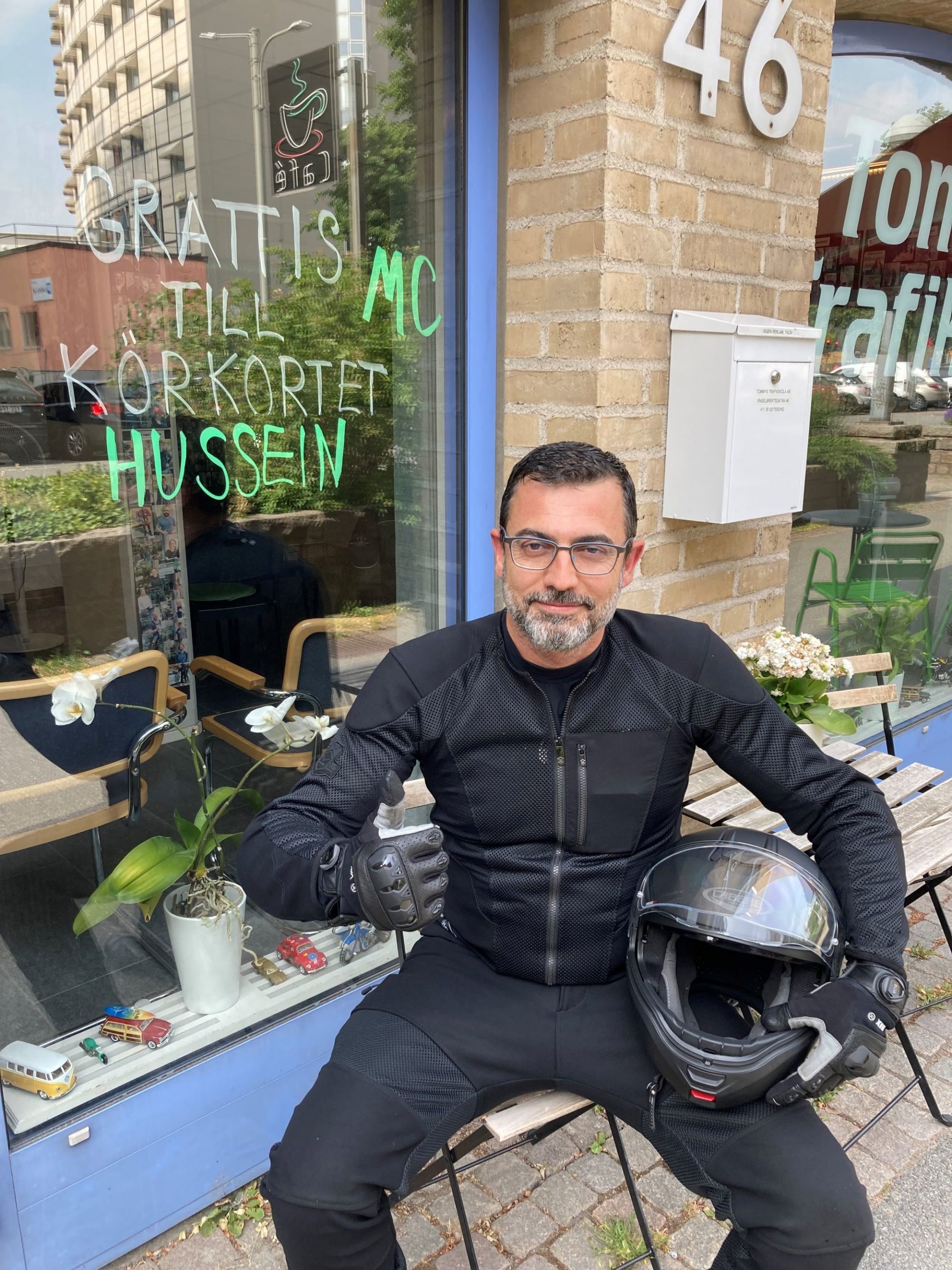 Hussein har kämpat hårt och har varit nervös inför uppkörningen. Men på uppkörningsdagen blev det ont om tid och han hade en kvart att värma upp. Han hann inte vara nervös då han var först ut på provet! Han körde felfritt och fick sitt mc-kort med stort leende på läpparna. Hussein har stort intresse för mc och har två motorcyklar som väntar på honom hemma. Nu kan han ta sina hojar och skutta runt i stan. 😀
